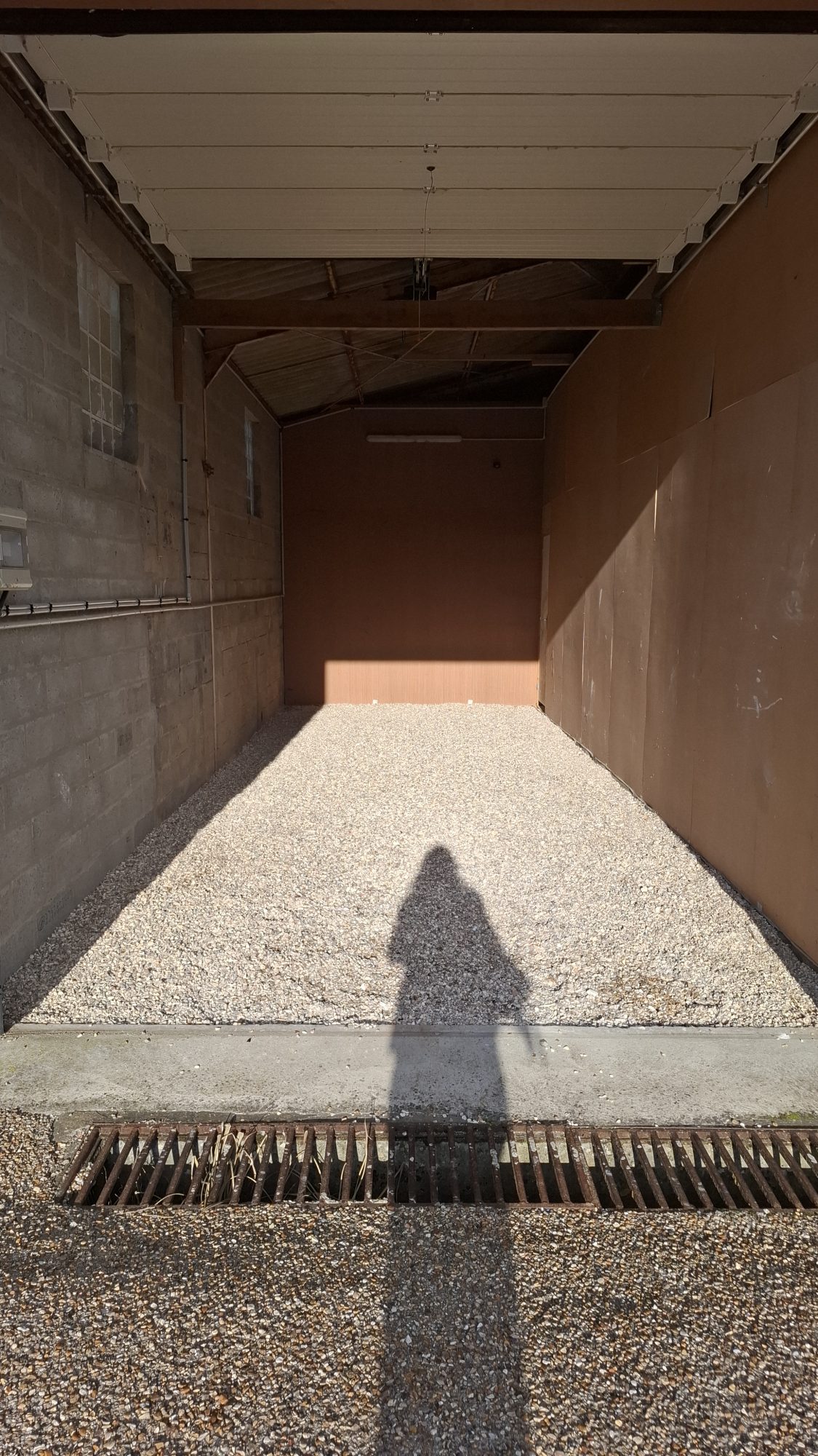 ST MARCEL, dans une quartier résidentiel, grand box de stationnement ou de stockage, gravier au sol, porte motorisée.
